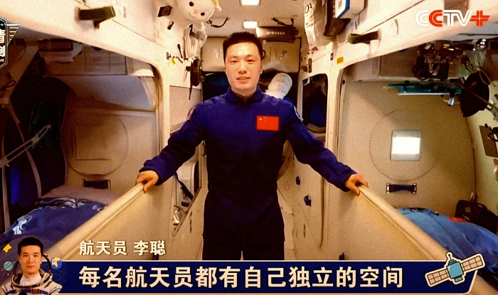 Les taïkonautes ont montré la cuisine, équipée d’un petit chauffe-eau et d’un four à micro-ondes modifié, et le compartiment de vie, doté de lits spacieux avec de grands hublots en face de chacun d’eux, qui donnent sur la Terre.